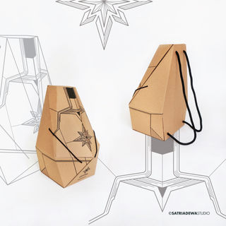 DIY Cardboard Backpack. Tas berbahan dasar kardus, dirakit sendiri di rumah. Tas ini merupakan official merchandise Film Gatotkaca yang dirilis tahun 2021. Berkolaborasi dengan Satria Dewa Studio.